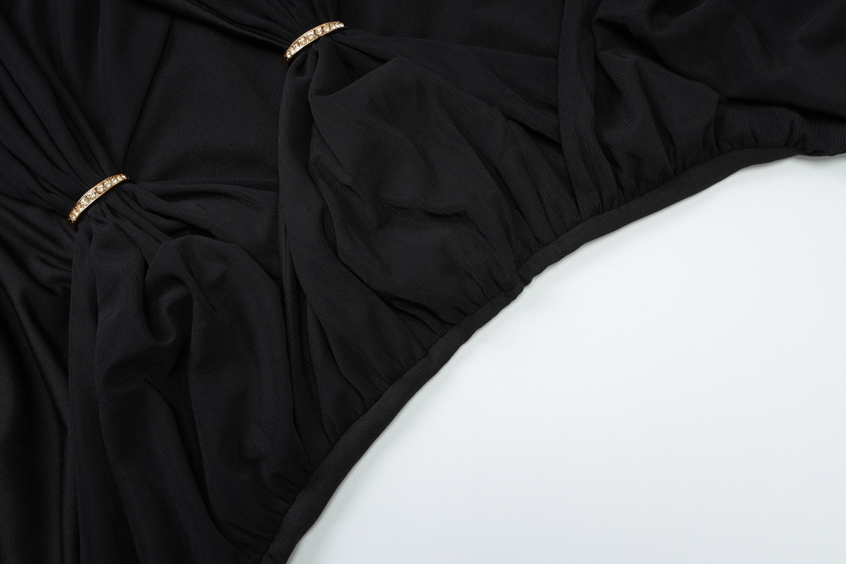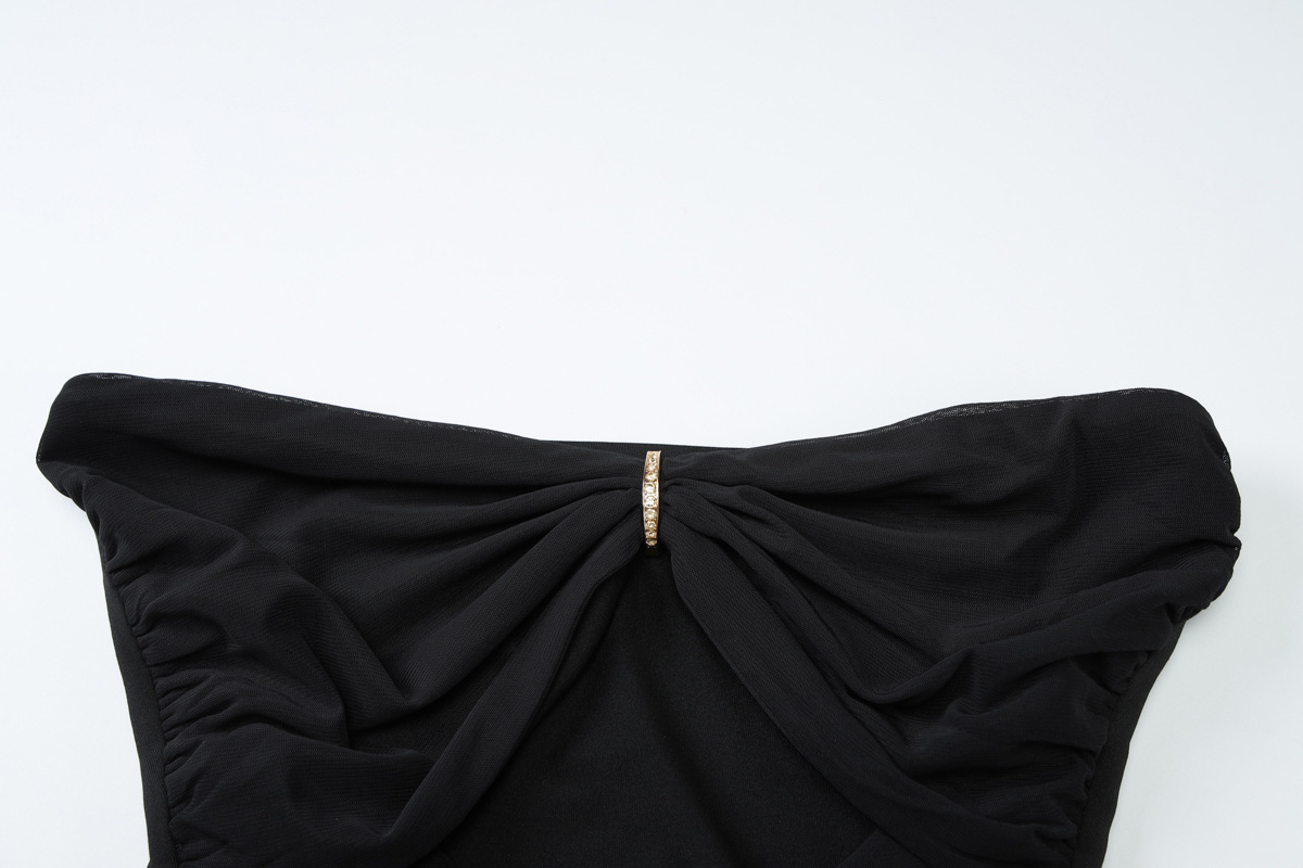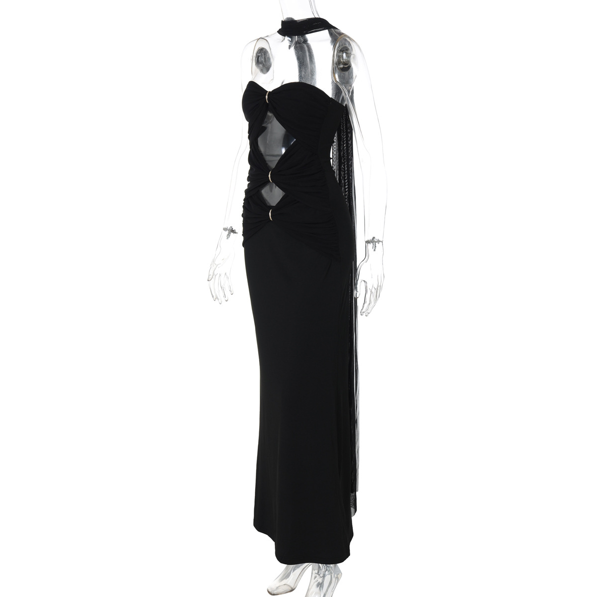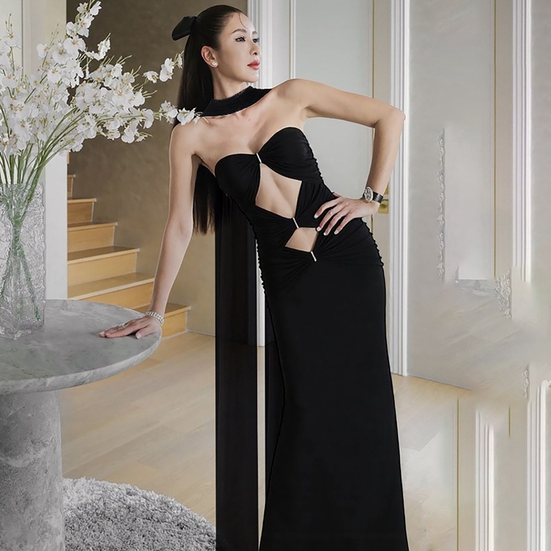 Craft details: Hollow-out, rhinestone embellishments, fishtail hem