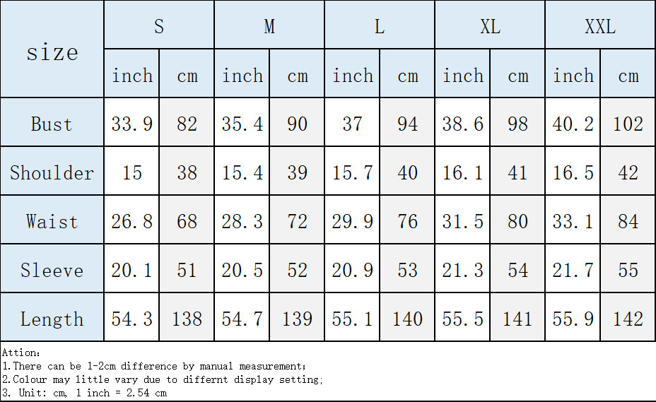 Note: 1. Asian sizes are 1 to 2 sizes smaller than European and American people. Choose the larger size if your size between two sizes. Please allow 2-3cm differences due to manual measurement. 2. Please check the size chart carefully before you buy the item, if you don’t know how to choose size, please contact our customer service. 3.As you know, the different computers display colors differently, the color of the actual item may vary slightly from the following images.